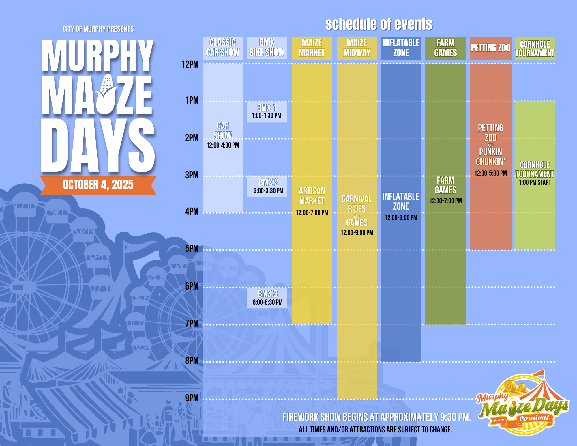 City of Murphy © 2024 – #MaizeDaysCORNival25 | Privacy Policy | Cookie Policy | Terms and Conditions